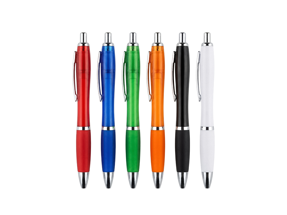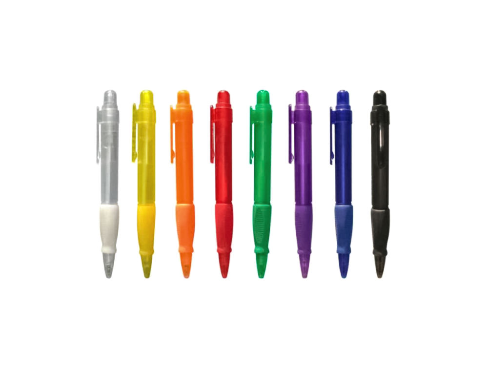 Descripción: Lapicero plástico transparente de sistema giratorio para la salida de la carga. Tiene goma antideslizante en la punta y resaltador amarillo.
